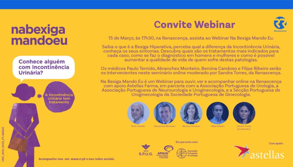 O webinar é feito em parceria com a Associação Portuguesa de Urologia (APU), Associação Portuguesa de NeuroUrologia e Uroginecologia (APNUG), e da Secção Portuguesa de Uroginecologia (SPUG) da Sociedade Portuguesa de Ginecologia (SPG) e conta com o apoio da Astellas Farma. O objetivo é promover, na Renascença, um espaço de discussão sobre a IU e a BH que irá juntar vários especialistas das áreas de intervenção de maior relevância destas patologias.