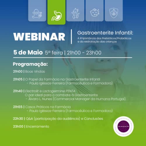 A sessão tem como tema central a “Gastroenterite Infantil: A Importância dos Prebióticos/Probióticos e da reidratação das crianças” e explorará a importância do papel da farmácia e do farmacêutico no acompanhamento de casos de gastroenterite e desidratação infantil.