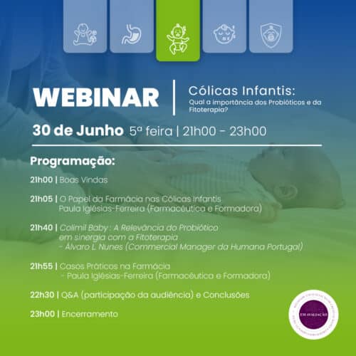 A sessão tem como tema central as “Cólicas Infantis: Qual a importância dos Probióticos e da Fitoterapia?” e explorará a importância do papel da farmácia e do farmacêutico no acompanhamento de casos de cólicas infantis.