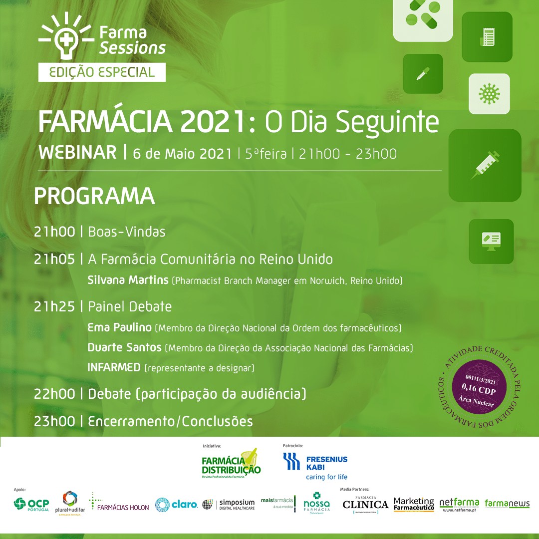 A revista FARMÁCIA DISTRIBUIÇÃO organiza mais uma edição FARMA SESSIONS, no próximo dia 6 de maio, a partir das 21H. Com o tema “FARMÁCIA 2021: O Dia Seguinte” esta sessão irá trazer a visão de quem conhece uma realidade diferente, bem como discutir o futuro das farmácias comunitárias com as entidades que poderão alterar o panorama nacional.