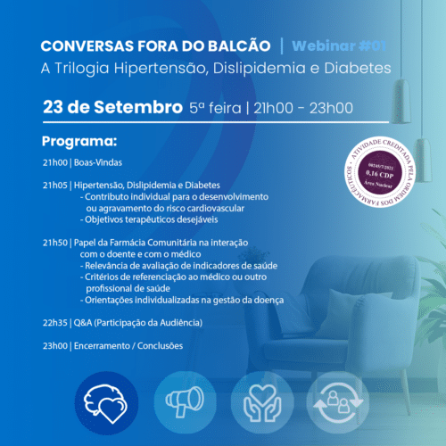 A primeira sessão do ciclo de formação CONVERSAS FORA DO BALCÃO, uma iniciativa da SERVIER Portugal powered by FARMÁCIA DISTRIBUIÇÃO, que conta com 4 webinars, realiza-se já no próximo dia 23 de setembro, com o tema “A Trilogia Hipertensão, Dislipidemia e Diabetes”.