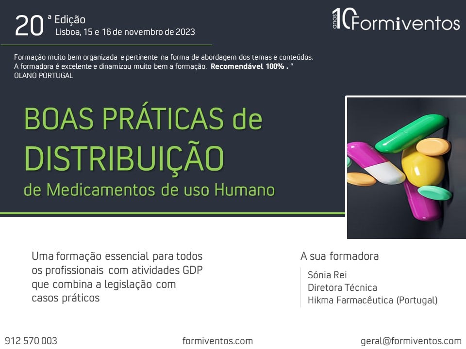 Nos próximos dias 15 e 16 de novembro de 2023 , decorrerá uma nova edição da formação sobre as BOAS PRÁTICAS DE DISTRIBUIÇÃO DE MEDICAMENTOS , uma formação dinâmica, super interessante donde são abordados os temas de forma prática e concisa e adaptadas às várias realidades .