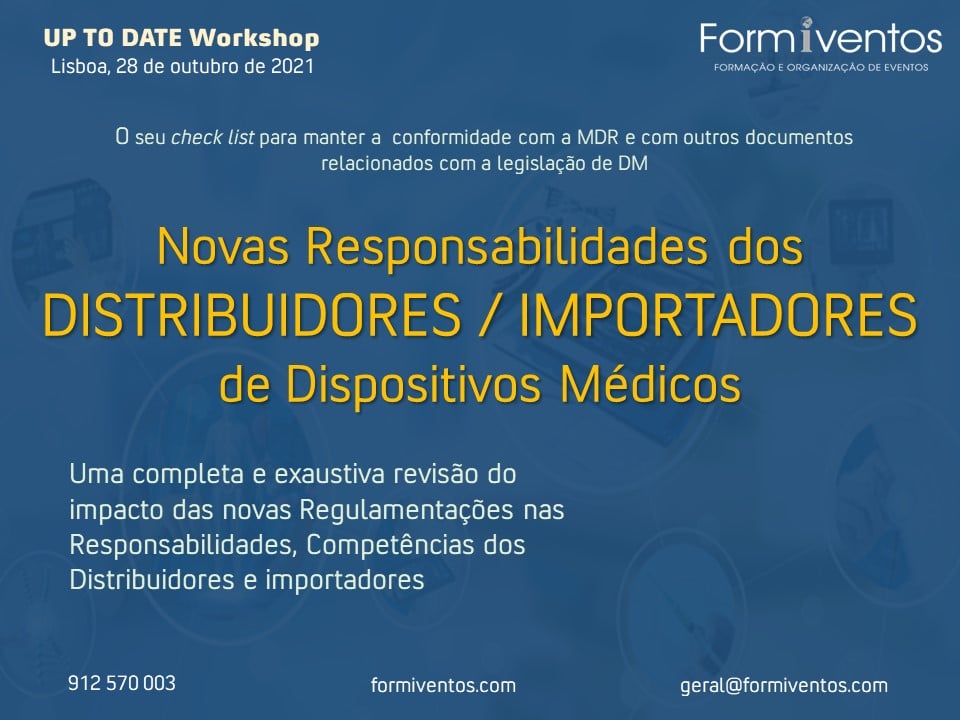 Apresentamos uma formação exclusiva , conduzida pela reconhecida especialista Dra. Sónia Ferreira,Diretora Técnica e Diretora de Qualidade, da A MARTINS & FERNANDES SA, GUERBET PORTUGALO, bajo o lema ” O seu check list para garantir a conformidade com o novo Regulamento (MDR) e com outros documentos relacionados com a legislação de DM