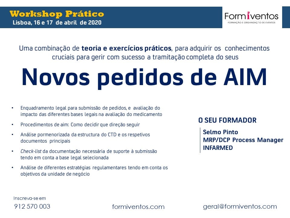 Apresentamos uma formação exclusiva, conduzida pelo reconhecido especialista Dr Selmo Pinto,MRP/DCP Process Manager do INFARMEDU; que inclui uma combinação de teoria e exercícios práticos, para adquirir os conhecimentos cruciais para gerir com sucesso a tramitação completa do seus Novos pedidos de AIM