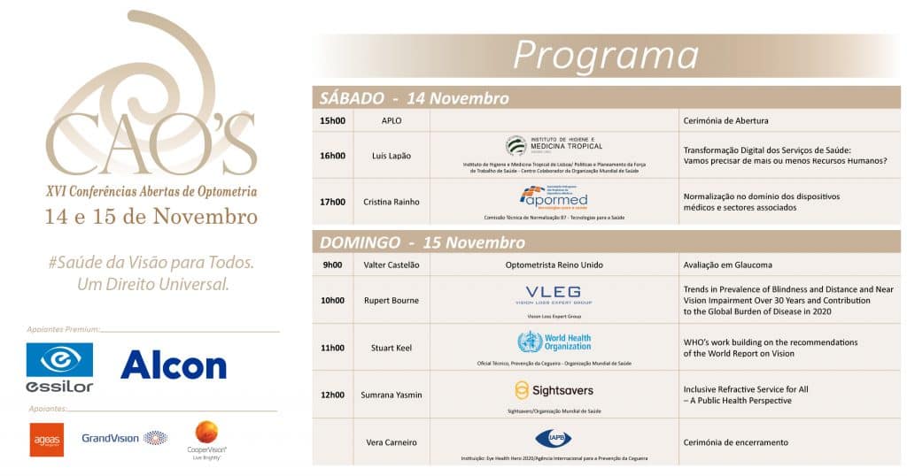 E acrescenta: “O nível das apresentações e dos oradores da XVI Edição das Conferências Abertas de Optometria fala por si mesmo. Contaremos com a participação de personalidades e organizações de relevo nacional e internacional no panorama da saúde. É importante enfatizar a apresentação pública e mundial, pela primeira vez, do plano e trabalho desenvolvido pela Organização Mundial da Saúde em sequência do Relatório sobre a Visão”.