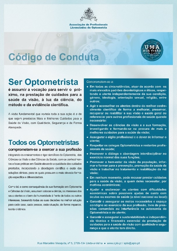 A Associação de Profissionais Licenciados em Optometria (APLO), acaba de divulgar com os mais de 1.200 membros, o código de conduta dos optometristas. Este novo código vem colmatar a necessidade de mostrar ao público todas as bases que orientam o trabalho dos optometristas enquanto profissionais de saúde.