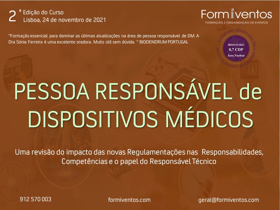 No próximo dia 24 de novembro terá lugar em Lisboa a 2ª edição da formação sobre PESSOA RESPONSÁVEL de DISPOSITIVOS MÉDICOS, bajo o lema “Uma revisão do impacto das novas Regulamentações nas Responsabilidades, Competências e o papel do Responsável Técnico.