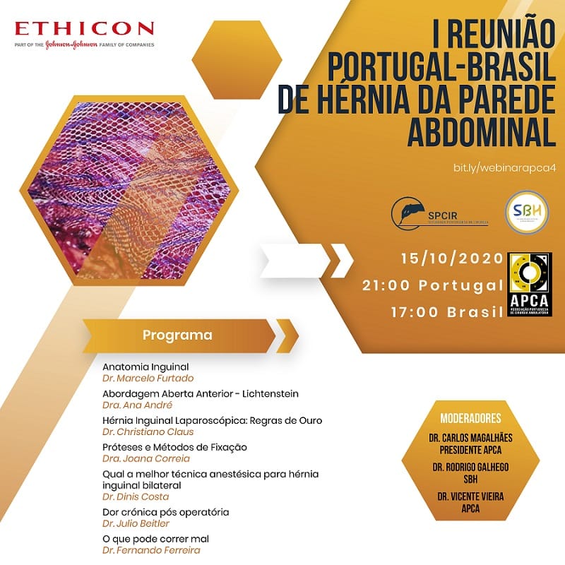 A Associação Portuguesa de Cirurgia Ambulatória (APCA), em conjunto com a Sociedade Portuguesa de Cirurgia e com a Sociedade Brasileira de Hérnia e Parede Abdominal, vai realizar a I Reunião, entre Portugal e Brasil, subordinada ao tema “Hérnia da Parede Abdominal”, cujo objetivo é a atualização de conceitos e a partilha de experiências sobre a cirurgia da parede abdominal. O evento tem data marcada para o dia 15 de outubro, pelas 21h00 (17h00 no Brasil).