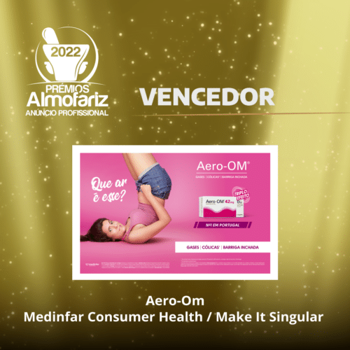 As premiações começaram com o galardão de Anúncio Profissional do Ano, entregue ao Aero-Om da Medinfar Consumer Health, feito pela Agência Make It Singullar. Hugo Luz (Marketing Manager Consumer Health & Dermatology) e Joana Catarino (Brand Manager Aero‐OM) da Medinfar Consumer Health e Vanessa Silva (Diretora Geral) e Inês Galveia (Diretora New Business e Estratégia) da Make It Singullar receberam o prémio.