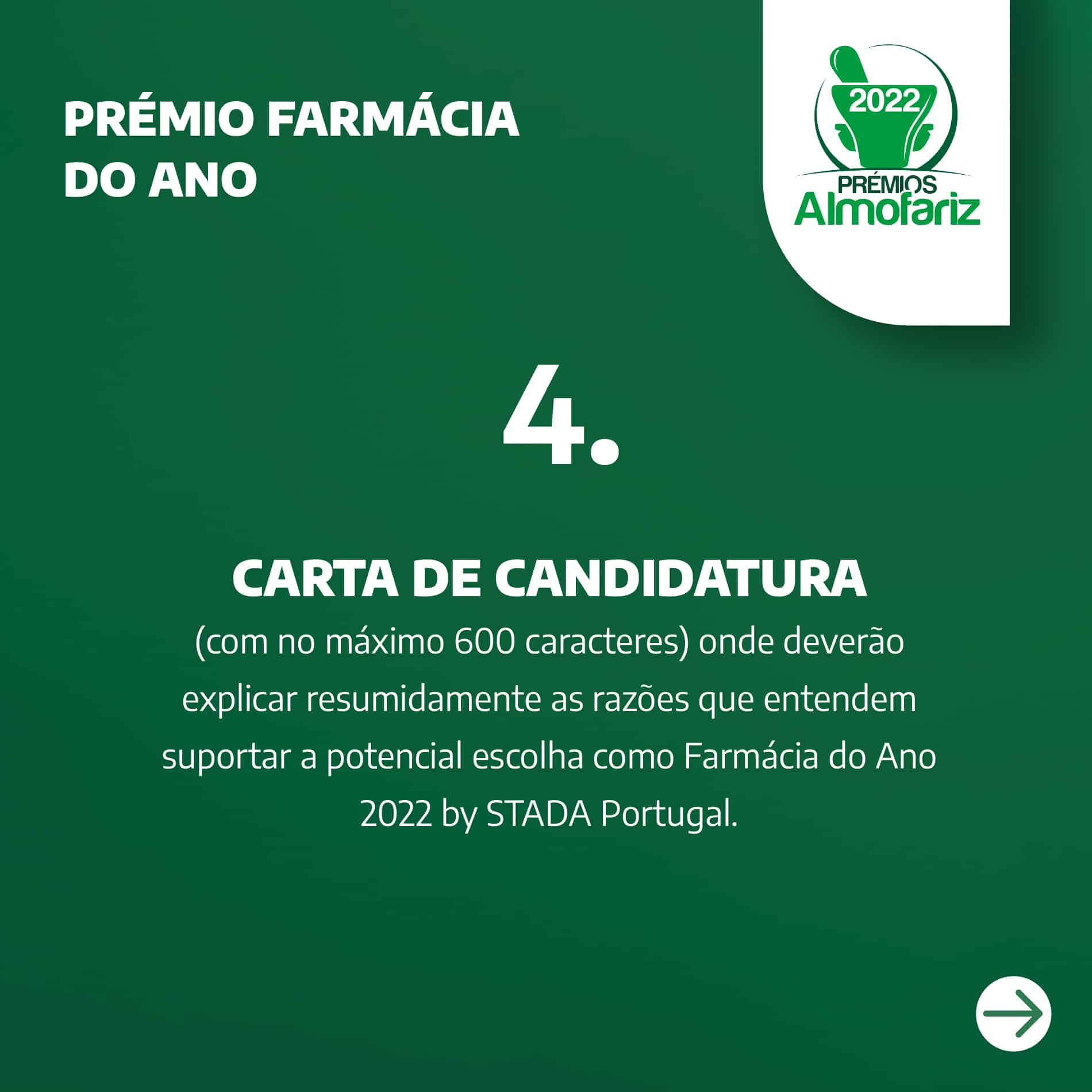 Da totalidade das candidaturas recebidas, serão selecionadas 3 para apresentação posterior aos membros do júri. Esta seleção dos 3 nomeados para a categoria Farmácia do Ano 2022 by STADA Portugal é, numa primeira fase, da responsabilidade da revista FARMÁCIA DISTRIBUIÇÃO. Sendo que a escolha do vencedor de entre os 3 nomeados é da responsabilidade do júri, constituído para o efeito.