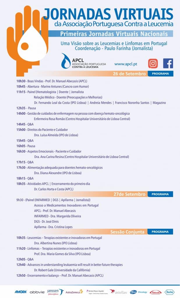 A Associação Portuguesa Contra a Leucemia (APCL) realiza nos próximos dias 26 e 27 de setembro as primeiras Jornadas Nacionais “Uma Visão sobre as Leucemias e Linfomas em Portugal”, com participação em formato virtual, destinadas a doentes e cuidadores. As inscrições para este evento são gratuitas e podem ser feitas online aqui: https://forumdideias.eventsair.com/apcl2020/registos/Site/Register