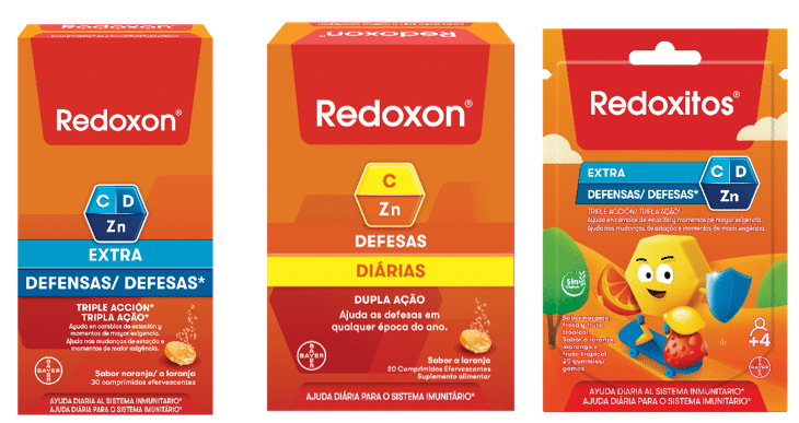 - Redoxon Extra Defesas: com tripla ação (com vitamina C, D e Zinco) desenvolvido para momentos em que é necessária uma proteção imunitáriaadicional, ajudando a reforçar as defesas do organismo contra os desafios intensos;