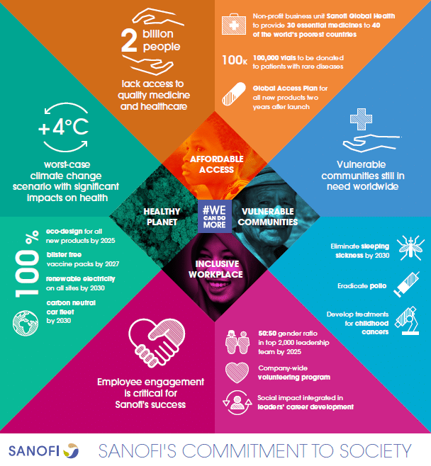 A pedra angular da estratégia de RSC da Sanofi, a Sanofi Global Health é uma unidade sem fins lucrativos recém-formada dentro da empresa. Aproveitando o amplo e diversificado portefólio de medicamentos e a sua presença global, a Sanofi Global Health vai focar-se em facilitar o acesso a medicamentos considerados essenciais pela Organização Mundial da Saúde (OMS) para doentes em 40 países de baixo rendimento. Trinta dos medicamentos da Sanofi serão fornecidos numa ampla gama de áreas terapêuticas, incluindo doenças cardiovasculares, diabetes, tuberculose, malária e cancro. A Sanofi Global Health também financiará a formação de profissionais de saúde ou o estabelecimento e desenvolvimento de sistemas de atendimento sustentáveis para quem sofre de doenças crónicas e necessite de cuidados complexos.