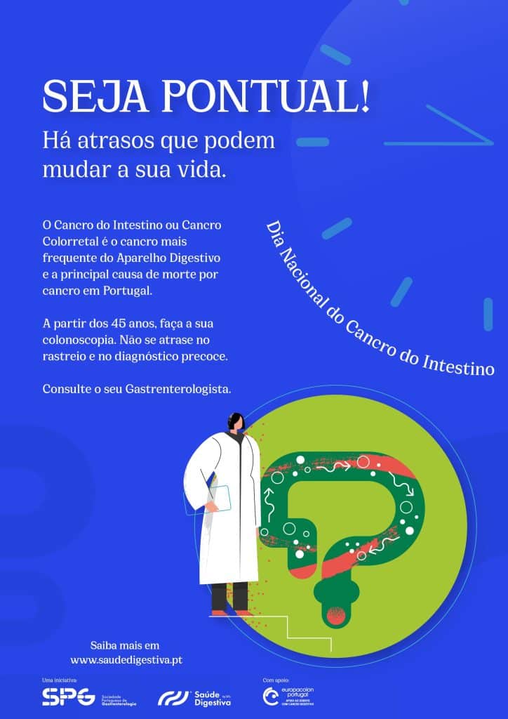 A Sociedade Portuguesa de Gastrenterologia (SPG), com o apoio da Europacolon Portugal, está a promover uma campanha nacional de consciencialização para o cancro do intestino, o cancro mais frequente do aparelho digestivo e a principal causa de morte por cancro em Portugal. Sob o mote “Seja pontual! Há atrasos que podem mudar a sua vida!”, a iniciativa surge no âmbito do Dia Nacional do Cancro do Intestino, assinalado a 30 de setembro, e sublinha a importância do rastreio e do diagnóstico precoce a partir dos 45 anos, essenciais para a redução da mortalidade associada à doença.