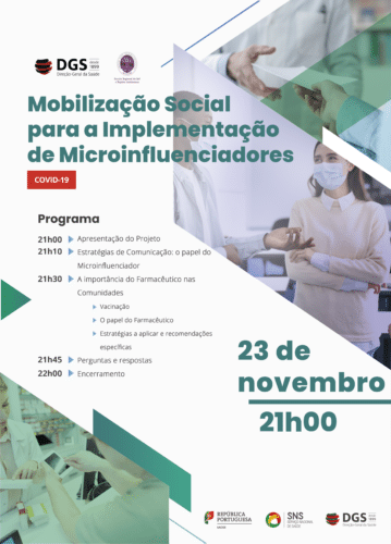 No próximo dia 23 de novembro, a partir das 21:00, a Direção-Geral da Saúde (DGS) e a Secção Regional do Sul e Regiões Autónomas da Ordem dos Farmacêuticos (SRSRA-OF) promovem um webinar dedicado à “Mobilização social para a implementação de microinfluenciadores”.