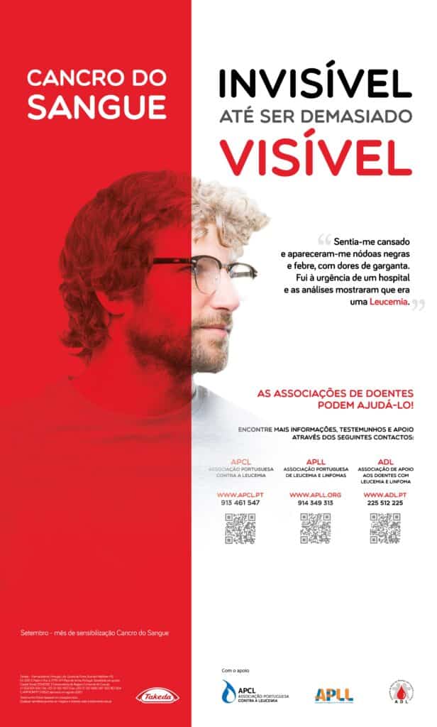 Para assinalar esta data, promover mais conhecimento em torno destes tipos de cancro e alertar para os principais sinais e sintomas, a Takeda, com o apoio das associações de doentes Associação Portuguesa Contra a Leucemia (APCL), Associação Portuguesa de Leucemias e Linfomas (APLL) e Apoio aos Doentes com Leucemia e Linfoma (ADL) volta a lançar a campanha “Invisível Até Ser Demasiado Visível”.