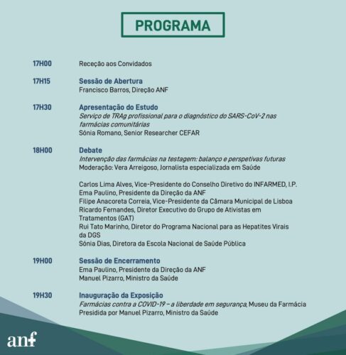 O programa inclui uma Mesa Redonda, moderada pela jornalista especializada em Saúde, Vera Arreigoso, sobre a “Intervenção das farmácias na testagem: balanço e perspetivas futuras”, com a participação Ema Paulino (ANF); Rui Tato Marinho (DGS); Sónia Dias (ENSP-NOVA); Ricardo Fernandes (GAT) e Filipe Anacoreta Correia, vice-presidente da Câmara Municipal de Lisboa.