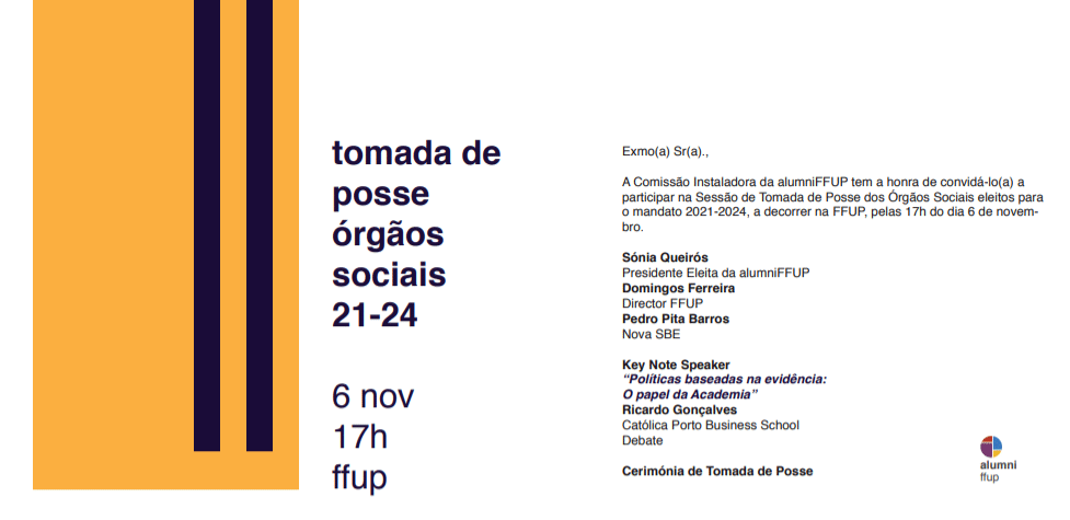 No próximo dia 6 de novembro, pelas 17:00, a alumniFFUP da Faculdade de Farmácia da Universidade do Porto (FFUP) organiza a sessão de Tomada de Posse dos Órgãos Sociais para o mandato de 2021/2024.