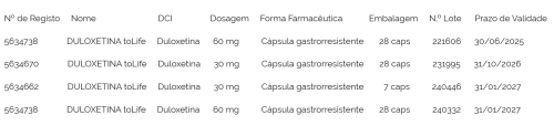 A Towa Pharmaceutical vai recolher voluntariamente lotes de Duloxetina toLife, Duloxetina, cápsula gastrorresistente, nas dosagens de 30mg e 60mg “por ter sido detetado um resultado analítico acima dos limites aceitáveis para uma impureza”, noticiou, na quarta-feira, a Autoridade Nacional do Medicamento e Produtos de Saúde (Infarmed), no seu portal.