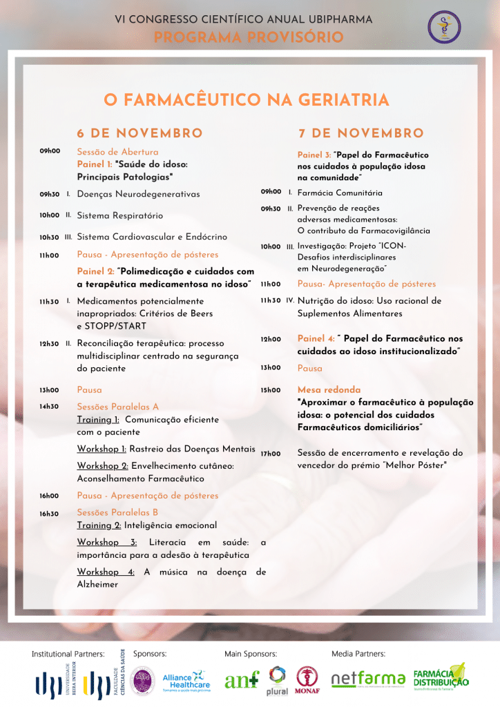 O UBIPharma, Núcleo de Estudantes de Ciências Farmacêuticas da Universidade da Beira Interior, realizará nos dias 6 e 7 de novembro o VI Congresso Científico Anual subordinado ao tema “O Farmacêutico na Geriatria”, via videoconferência.