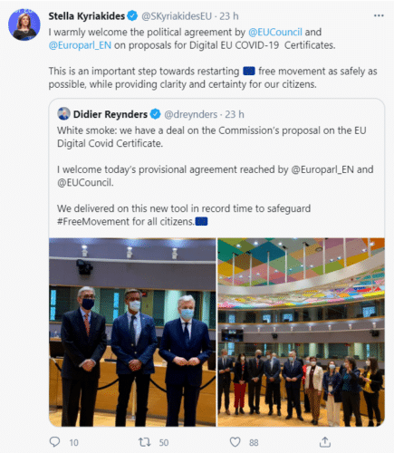 Também a comissária europeia da Saúde, Stella Kyriakides, saudou no Twitter, este acordo, classificando-o como “um passo importante para o reinício da livre circulação na UE com a maior segurança possível, ao mesmo tempo que proporciona clareza e certeza aos cidadãos”.