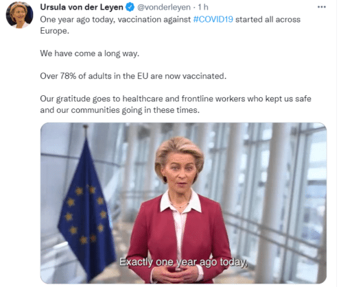 “Exatamente há um ano, as campanhas de vacinação contra a covid-19 começaram em toda a Europa e percorremos um longo caminho no espaço de um ano: mais de 78% dos adultos na União Europeia estão agora [totalmente] vacinados”, declarou.