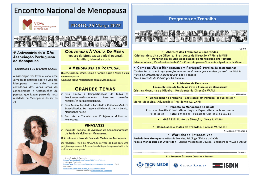 Para assinalar o primeiro aniversário, a VIDAs – Associação Portuguesa de Menopausa (VAPM) vai realizar no dia 26 de março, em Casa de Vilar, no Porto, a primeira edição do Encontro Nacional da Menopausa destinado a todas as pessoas e entidades com interesse no tema.