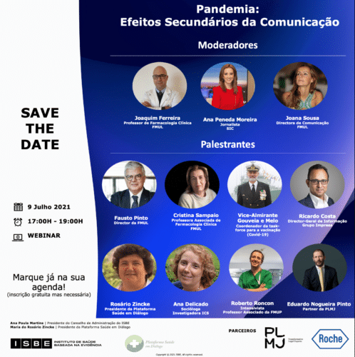 No próximo dia 9 de julho, entre as 17:00 e as 19:00, realiza-se o webinar “Pandemia: Efeitos Secundários da Comunicação”, promovido pela Plataforma Saúde em Diálogo e pelo Instituto de Saúde Baseada na Evidência (ISBE).