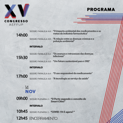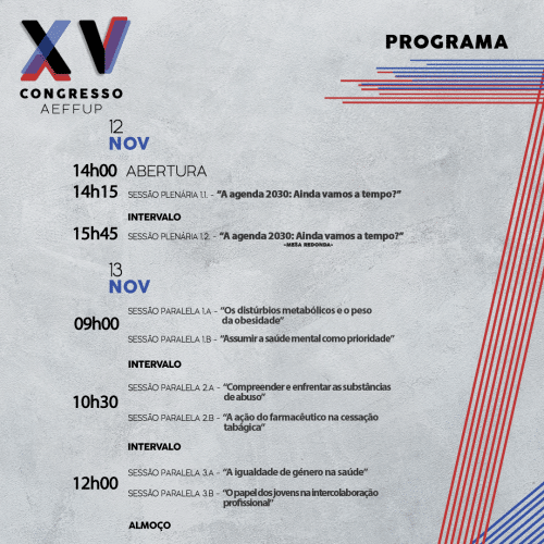 Nos próximos dias 12, 13 e 14 de novembro, terá lugar o XV Congresso AEFFUP organizado pela Associação de Estudantes da Faculdade de Farmácia da Universidade do Porto, sob o tema “A Saúde e a Agenda 2030”.