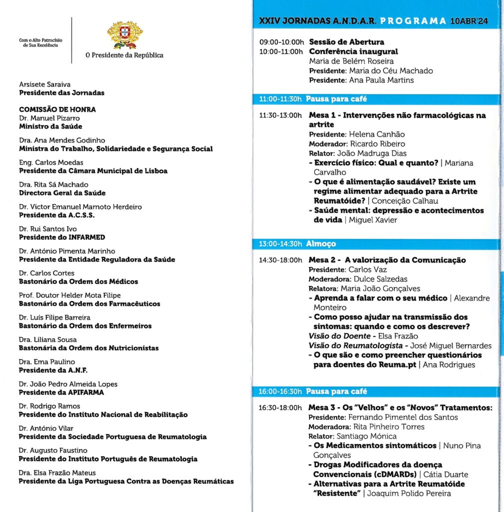 Arsisete Saraiva, Presidente da A.N.D.A.R, defende que as XXIV Jornadas são “um passo firme na missão de unir esforços para melhorar a qualidade de vida dos doentes com Artrite Reumatóide em Portugal”. Mais do que a abordagem à componente física, estamos empenhados em promover o acesso a informações atualizadas, tratamentos eficazes e a ferramentas que promovam o bem-estar emocional e social de todos os que são afetados por esta doença”.